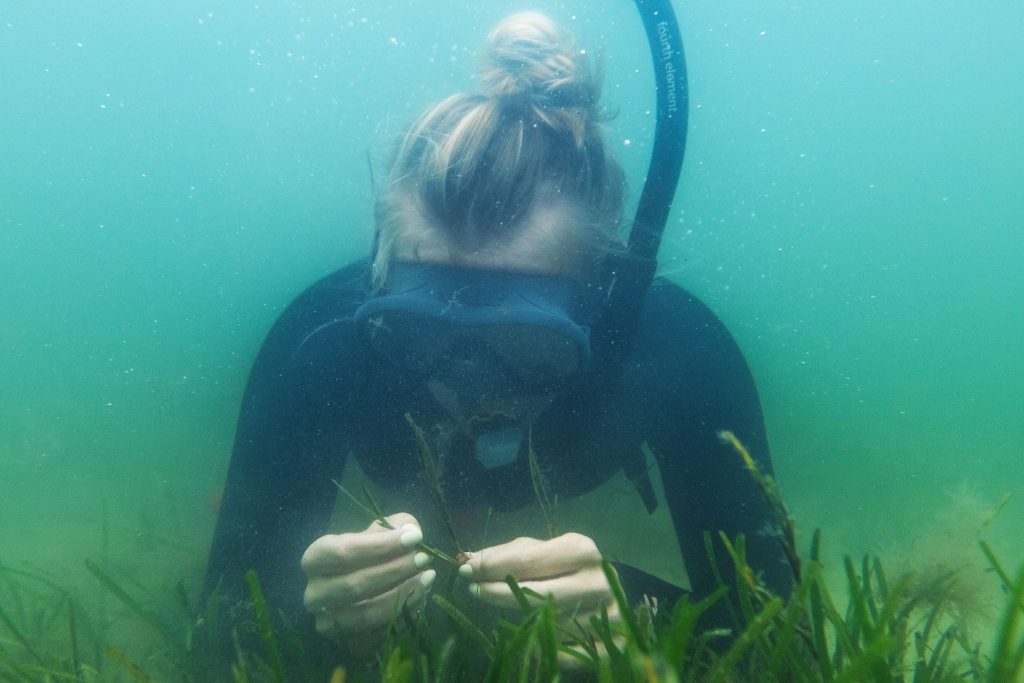 Kelly Fietz, undergraduate student, harvesting reproductive eelgrass shoots underwater. Photo credit: Novak Lab Boston University